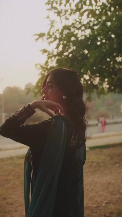 An elegant ensemble designed for timeless occasions. Minal features a luxurious French velvet shirt paired with a classic farshi shalwar, creating a graceful and regal silhouette. The shirt is adorned with intricate cut dana work, adding subtle sparkle and refined detail. A medium silk dupatta completes the look, bringing balance and fluidity to the outfit.